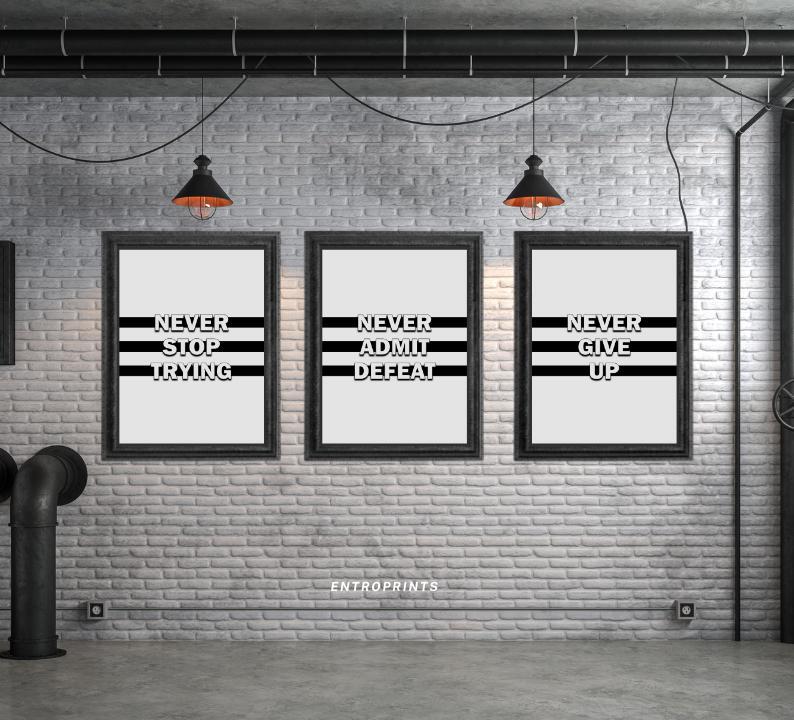 A set of three portrait style digital art to motivate you through your tougher days and elevate you through the better days. Featuring the powerful messages "Never Give Up", "Never Stop Trying", and "Never Admit Defeat" this poster serves as a constant reminder to stay motivated, focused, and determined. The minimalist design can do with any room style and is a great gift for a home office or work environment. A budget friendly gift you can download instantly and print at home!